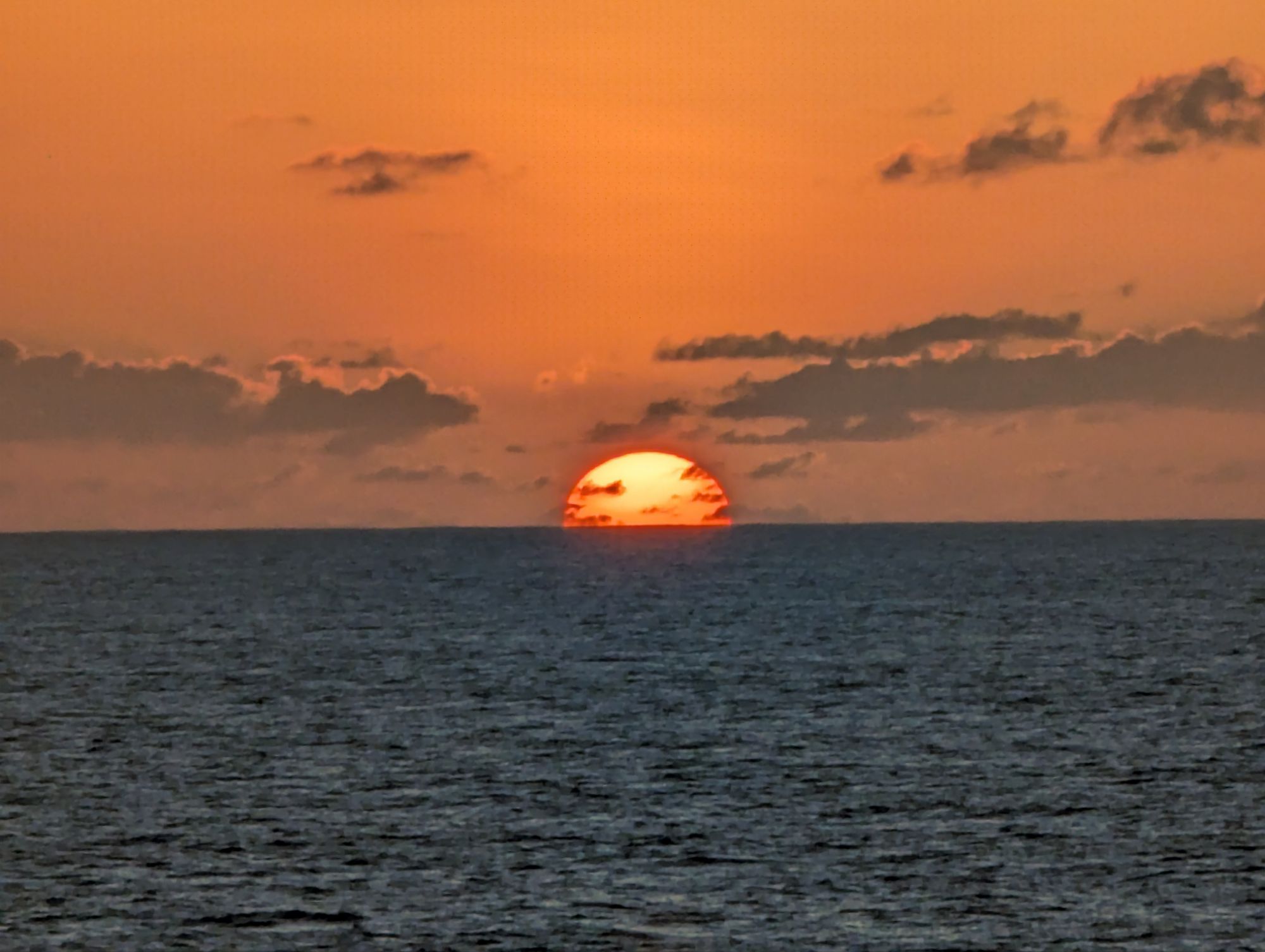 We are on the starboard side (right side) of the ship and heading south towards Fiji, (our next stop was Samoa but was changed to Fiji)… So we get to catch all the sunsets and “moonsets”…. Heres today’s sunset…